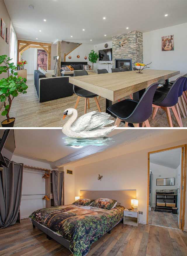 Au rez-de-chaussée, vous disposerez d'une pièce de vie avec cuisine équipée ouverte sur un salon/séjour, une spacieuse chambre triple (3 lits pouvant être proposés en lit double ou lits séparés), une salle de bain (douche, baignoire, double vasque), 2 WC indépendants, une buanderie. A l'étage, vous trouverez 2 chambres doubles (lits pouvant être séparés), une suite parentale (lit 160x200) avec salle d'eau privative, une chambre/bureau (lit 1 personne). A l'extérieur, vous profiterez d'un parking, d'une terrasse privative (salon de jardin, parasol, barbecue, transats) et d'un trampoline. Une salle de sport dédiée aux gites est accessible gratuitement ainsi qu'un espace bien-être avec sauna/hammam/jacuzzi/coin tisanerie/sanitaires (supplément de 60€ pour une séance de 1h30). Piscine à partager d' avril à septembre inclus